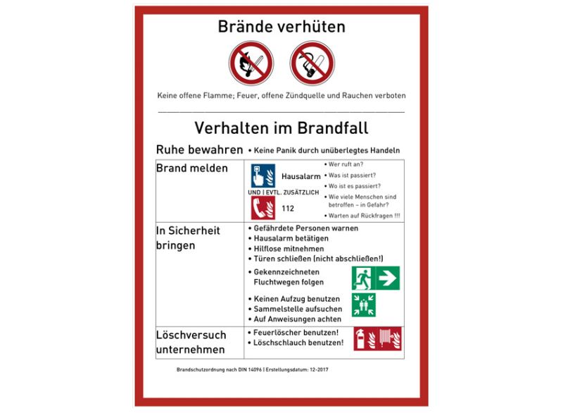 In kurzer Form enthält sie Handlungsanweisungen und Regeln zur Brandverhütung und zum Verhalten im Notfall (Ruhe bewahren, Brand melden, in Sicherheit bringen, Löschversuch unternehmen).